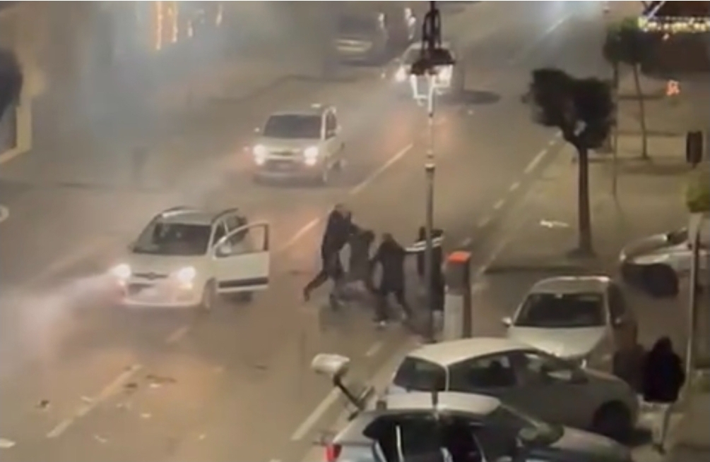 Secondo quanto emerge dalle immagini e dai racconti, un gruppo di giovani stava esplodendo petardi in strada, in via Campana. In pochi istanti la situazione è degenerata. Una vettura in transito è stata costretta a fermarsi. Il conducente è sceso dall’auto ed è stato accerchiato. Sono partiti pugni e calci. Una violenza improvvisa, davanti a testimoni.